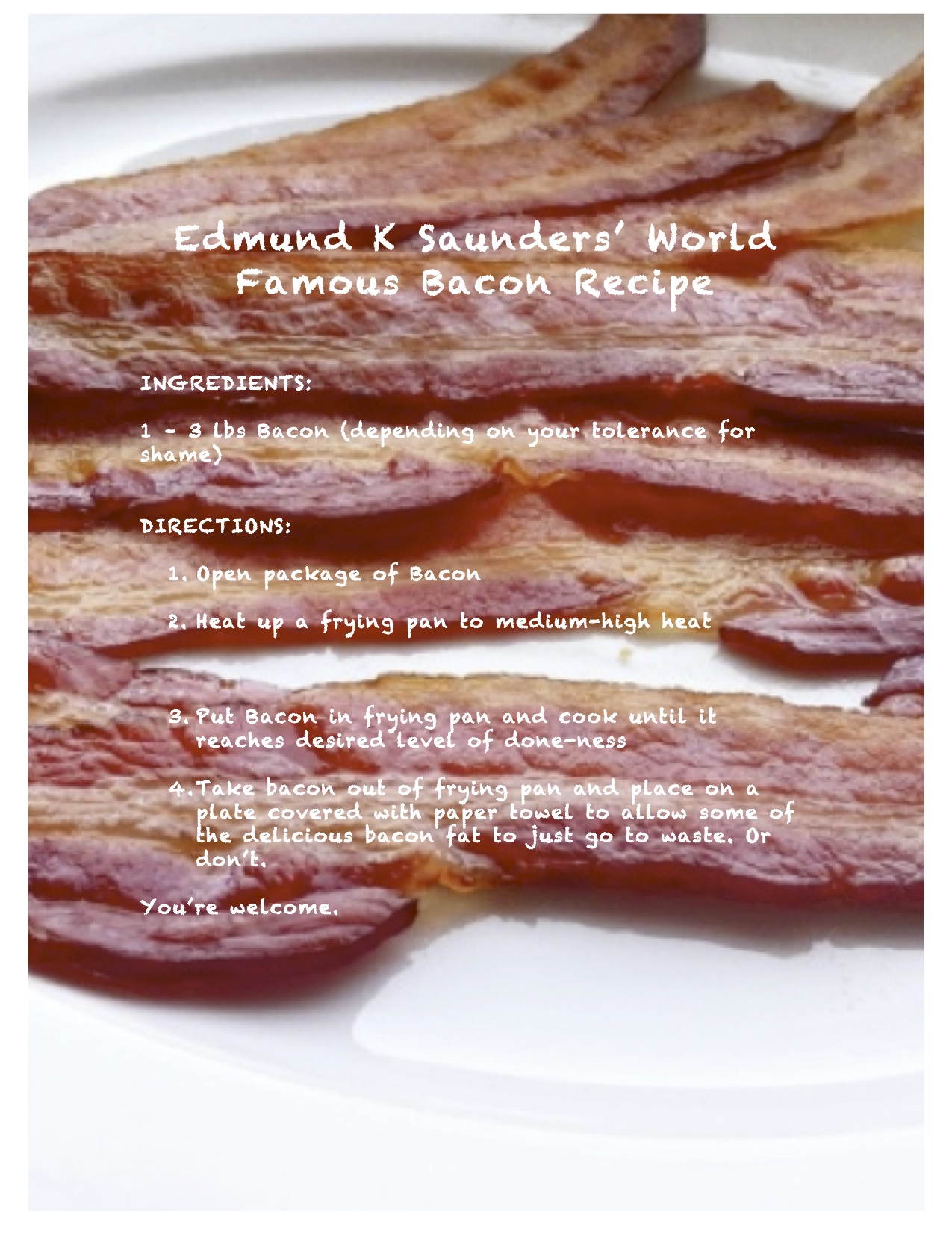My name is Edmund K Saunders, and I love bacon. There, I said it. Now I can dispense with all the lies and self-deceit about what a spiritual being I am, and come clean about the falsehood I treat my body as my temple.